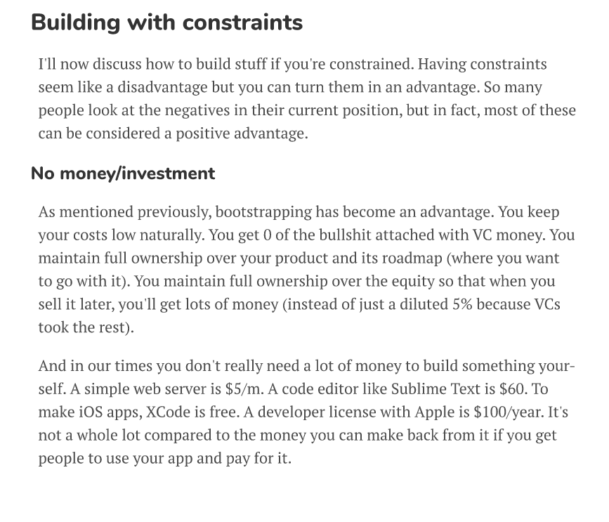Practice I want you to learn from actually shipping a product. This is just ideas that might be wrong or right, and biased, but your own personal practical experience will be the thing (if anything) making you successful. Not this book! This book is just me pushing you to go sit on the bicycle. Now learn to ride it yourself. Practice is everything. Get your own style. And most importantly, ship :)