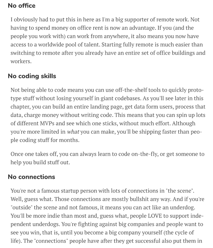 • Not a chapter but important: be ethical, and don't cut corners on ethics. You'll be rewarded by not doing dodgy stuff like spamming, manipulating your users into doing stuff, growth hacking your search rankings or faking your social media, or abusing your power to compete unfairly if you're successful. If you make a good product, you don't need any of this. If you make mistakes, own up to them and say sorry. Be nice as a person and especially as a company. Karma always pays back in the end. Just being ethical and nice is a competitive advantage these days because most companies (and people) are not!